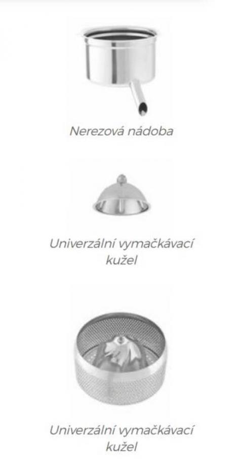 vhodný do náročných provozů pro vyšší výkon a robustní konstrukci lze použít všechny typy sklenic či džbánků – výška výpusti 220 mm lisuje pomocí odstředivé síly automatický start a stop při stisknutí vymačkávacího kužele stlačovací pákou přítlačná kloubová páka s nerezovým ochranným víkem, které zabraňuje vystříknutí vybaveno mikrospínačem pro spuštění při stlačení vymačkávacího kužele přítlačnou pákou vyjímatelný nerezový děrovaný košík s nerezovým univerzálním vymačkávacím kuželem nerezová nádoba vyjímatelná odkapní miska Barevné provedení: