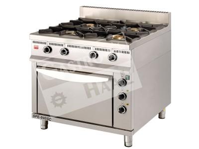 Gastronomický profesionální sporák s plynovými hořáky a elektrickou troubou se používá na vaření a pečení v kuchyních jídelen, hotelů, restaurací… Vyrobený s potravinářsky nezávadného nerezového materiálu. Sporák má samonosnou konstrukcí a nastaviteľné nožičky na vyrovnání nerovností podlahy. Čtyři plynové hořáky se zapalují večným plamínkem a jsou vybavené termoelektrickými pojistkami pro bezpečný provoz. Ovládací knoflíky plynových ventilů z thermosetu a mřížky na hořácích z masivní litiny. Trouba statická s možností zapnutí ventilátoru je obalená tepelnou izolací. Rozměr umožňuje použití gastronádob a plechů na pečení o rozměru GN 2/1 – 650×530 mm. Horní a spodní topné těleso je regulované současně, spodné teleso je vyklápěcí. Provozní teplota je nastaviteľná v rozsahu 50–280 °C. Provoz elektrické trouby je signalizovaná zelenou kontrolkou a činnosť topných těles bílou kontrolkou, která po dosažení požadované teploty zhasne. Celonerezové provedení trouby.