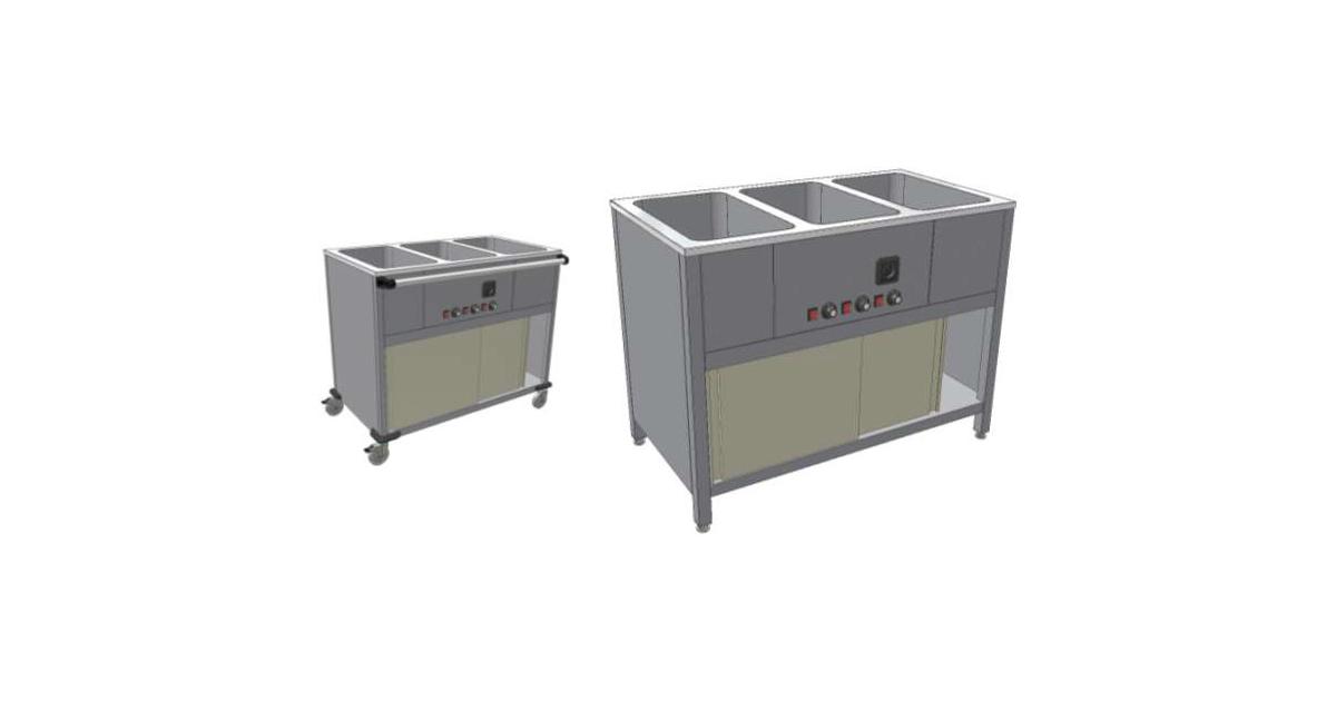 Výdejní stůl (vozík) se používá k přepravě, přihřívání a k výdeji hotových teplých jídel. Ta se do výdejního stolu (vozíku) vkládají v nerezových gastronádobách. Celonerezové provedení, výšková nastavitelnost o 30 mm nebo kolečka o průměru 100 mm (2× s brzdou). Vana a spodní vyhřívaný prostor disponuje samostatným topným tělesem , termostatem pro regulaci teploty až do 90°C a vypouštěcím ventilem. Možnost prokládacího provedení posuvnými dvířky. Ovládání a madlo na delší nebo kratší straně. Provedení na 2× GN, 3× GN nebo 4× GN. Dělící příčky k výdejním vozíkům vanovým jsou dodávány zdarma!