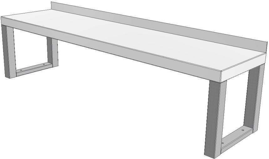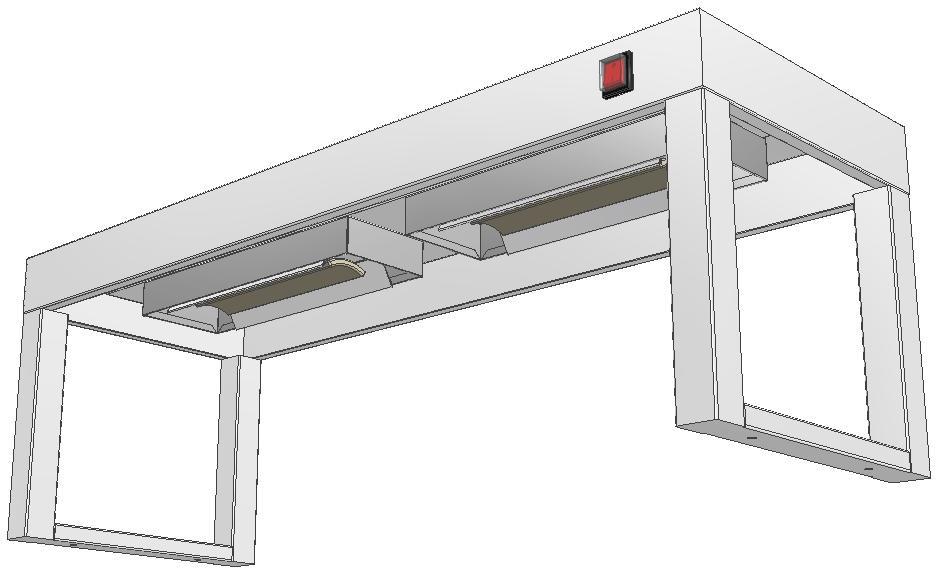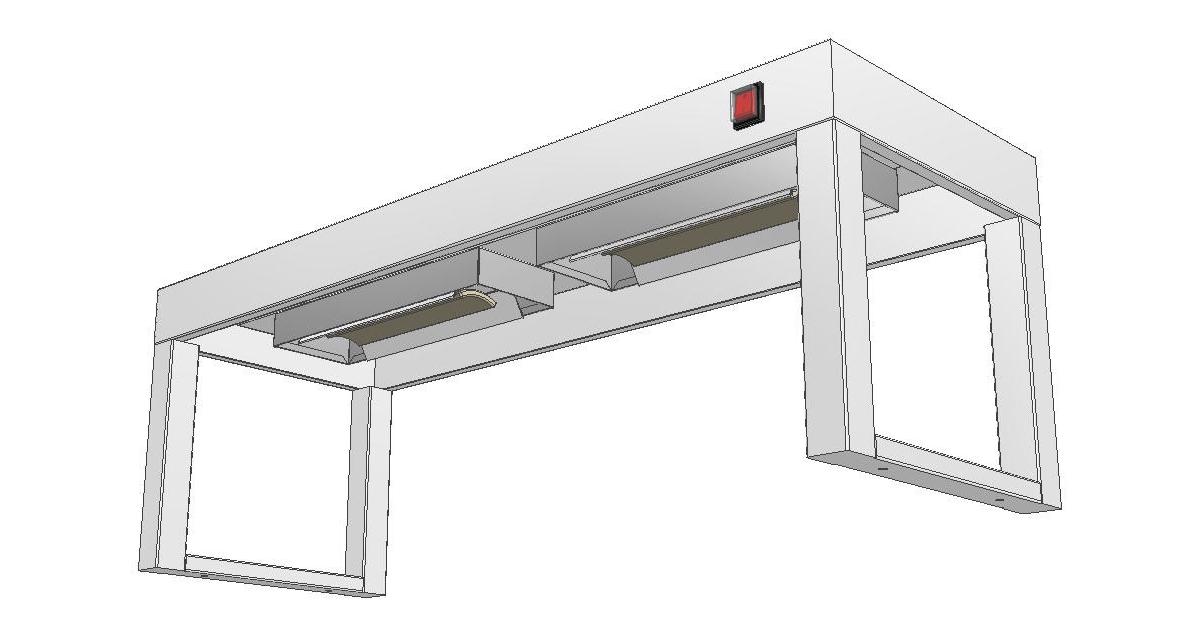 Celonerezové provedení. Police tl. 73 mm vyztužená podélnou výztuhou. Provedení bez lemů, zadní nebo bočni lemy výšky 40 mm. V polici infralampy 250 W, vypínač a regulátor výkonu. 1500×350