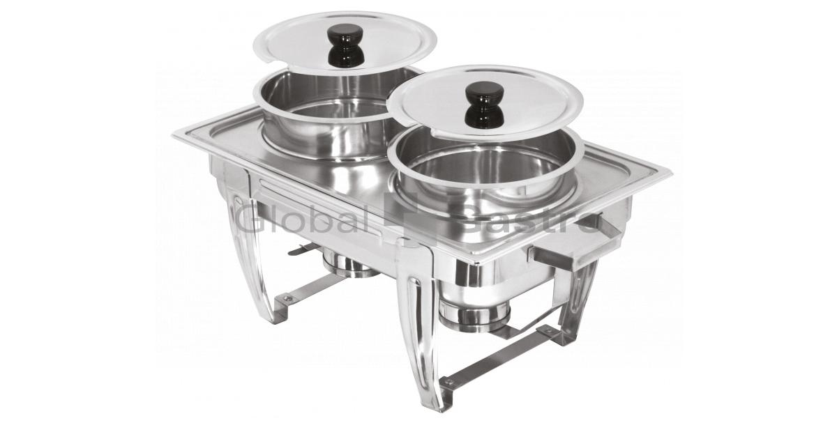 Polévkový nerezový chafing s kotlíky 2× 5 litrů, vhodné pro ethanolové i elektrické topení.