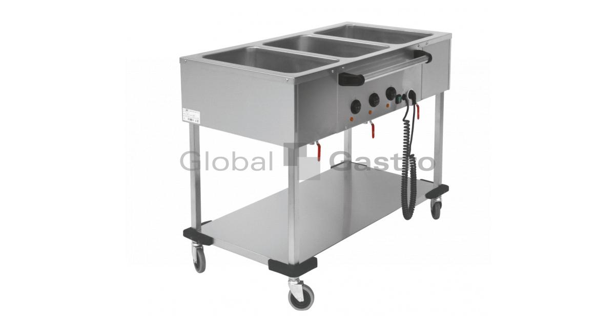 Celonerezový pojízdný výdejní stůl s vyhřívanou vodní lázní,v robustním provedení bez, nebo se spodní policí pevně spojenou s nohami, které jsou osazeny pojezdovými kolečky (2× brzděná).Vrchní deska s jednotlivými lisovaným vanami, každá samostatně regulována a vybavena výpustným ventilem.