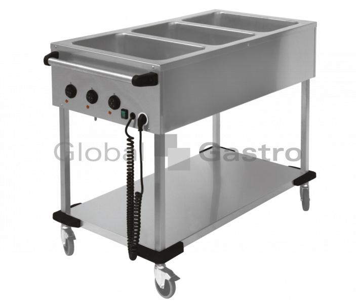 Celonerezový pojízdný výdejní stůl s vyhřívanou vodní lázní,v robustním provedení bez, nebo se spodní policí pevně spojenou s nohami, které jsou osazeny pojezdovými kolečky (2× brzděná).Vrchní deska s jednotlivými lisovaným vanami, každá samostatně regulována a vybavena výpustným ventilem.