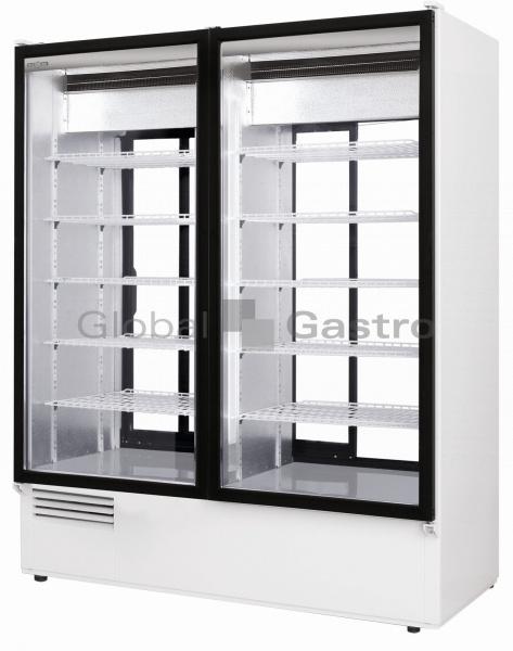Prosklené chladící skříně – vhodné pro prezentaci, prodej,uskladnění a uchování potravin díky šetrnému způsobu chlazení (statické gravitační). Hygienické provedení – vnější opláštění (bílý lak), nerezové dno vnitřního prostoru, stěny jsou vyrobeny z AL plechu. Skříň je vybavena dvěma samostatně oddělenými chladícími prostory vybavenými 5ks polohovatelných roštů z plastem pokryté oceli. Automatické odtávání, chlad.agregát Elektrolux, prosklené lehce posuvné dveře se samozavíráním,a křídlové dveře ze strany obsluhy pro snadné doplňování zboží.Přehledné mechanické ovládání a nastavení teploty.