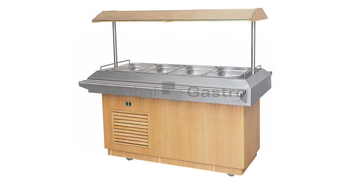 Chladící salátové bary slouží k uchování, prezentaci, a výdeji (samoobslužnému, obslužnému) připravených pokrmů. Nerezová lisovaná vana (snadná údržba a hygiena)umožňuje vkládat a kombinovat GN nádoby v rozměru 4× GN1/1 a menších s hloubkou do 150 mm. Díky pojízdnému provedení není problém tyto vozíky umístit kdekoli ve vašem provozu s možností využití dvou postranních nerezových odkládacích polic (možno sklopit, nebo zcela odebrat). Salátové vozíky jsou provedeny v imitaci ušlechtilého dřeva (O-dub a W-ořech) a nerezu. Teplota je řízena elektromechanickým termostatem umožňujícím nastavit teplotu od +2°C do +7°C (agregát Aspera – statické chlazení). Vozíky jsou vybaveny osvětlovací rampou.