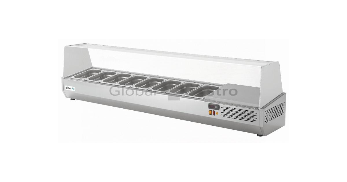 Pizza chladící nástavba Asber GV (dříve EV) – celonerezové provedení s vrchním skleněným zákrytem. Vnitřní prostor pro GN 1/3 nebo 1/4. Modely jsou dodávány bez GN.