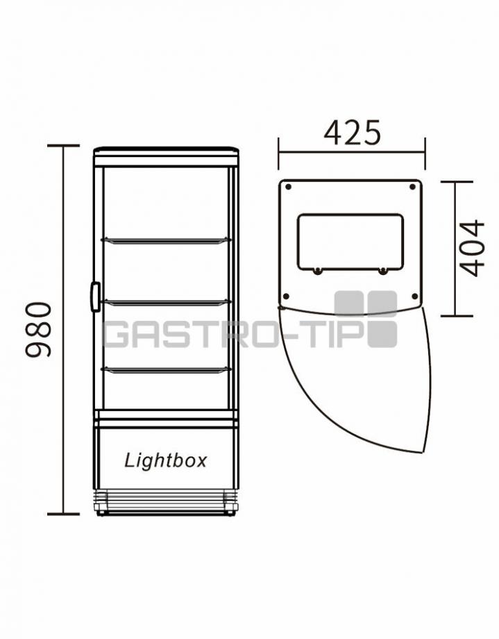Chladicí panoramatická vitrína RT-78L(1R) určena k prezentaci, uskladnění a prodeji potravin a nápojů. Vitrína je v elegantním černém provedení ze všech stran prosklená sklem (dvojitá izolovaná skla) přední strana s dvířky je v oblém provedení včetně skla, intenzivní oboustranné LED osvětlení, které neohřívá vnitřní prostor a výrazně napomáhá prezentaci a prodeji potravin ve všech patrech. Vitrína je ovládána elektronickým regulátorem se zobrazením teplot. Ventilovaný chladící systém s automatickým odtáváním. Výškově nastavitelné 3 police potažené PVC.