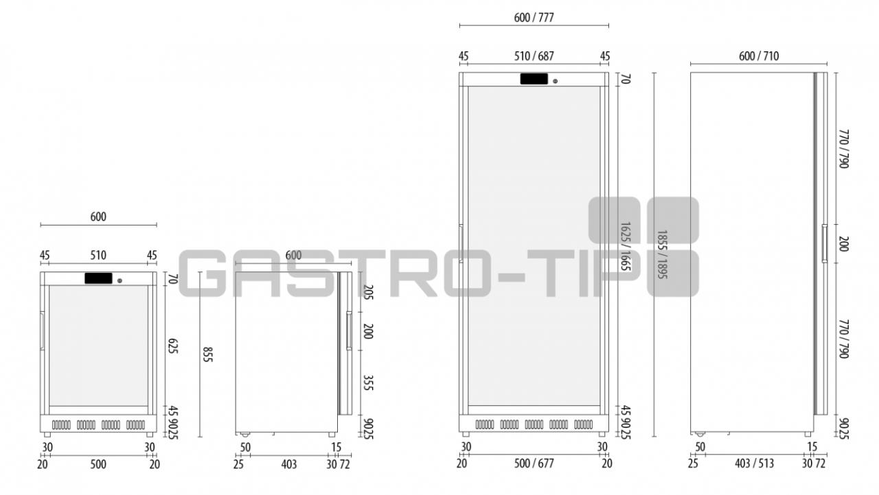 Vnější konstrukce z nerezové oceli Vnitřní konstrukce z ABS Statické deskové chlazení s ventilátorem pro rovnoměrnou teplotu Digitální řídicí jednotka integrovaná ve dveřích Automatické odpařování kondenzované vody Odmrazujte s vypnutým kompresorem Dvojité skleněné dveře s plastovým rámem Tloušťka izolace 40 mm Snadno odnímatelné magnetické těsnění Buňka se zaoblenými rohy Vnitřní LED světlo s vypínačem ON / OFF Zámek dveří s klíčem Vybaveno 3 mřížkami 650×525 mm a 1 mřížkou 650×335 mm