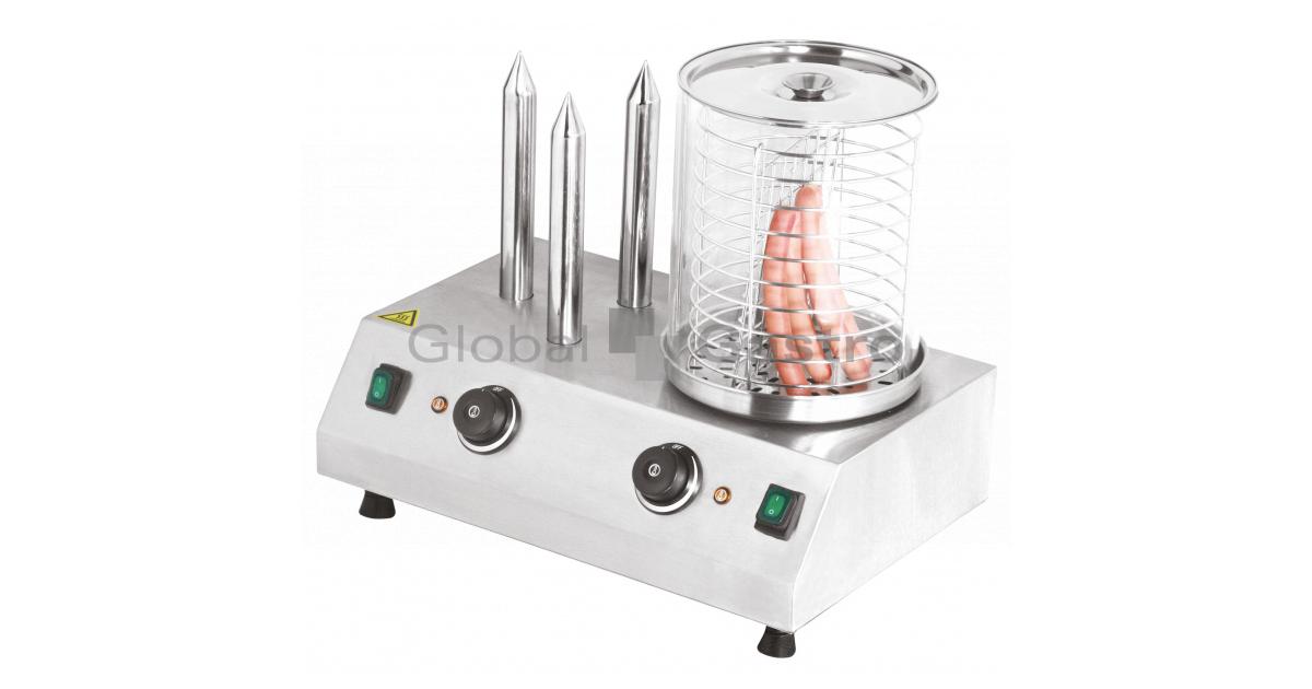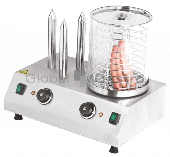 Elektrické zařízení na Hot dog. Nerezové provedení, samostatná regulace teploty trnů a ohřevu párků. Skleněný válec s děleným nerezovým košem. Teplotu ohřevu je možno plynule regulovat. Samostatně vyhřívané nerezové trny (vybaveny topným tělesem) s možností jednotné regulace teploty ohřevu rohlíků. Zařízení je vybaveno vypínači a kontrolkami chodu.