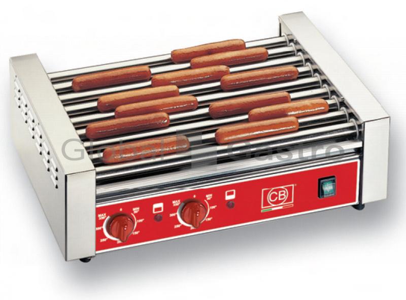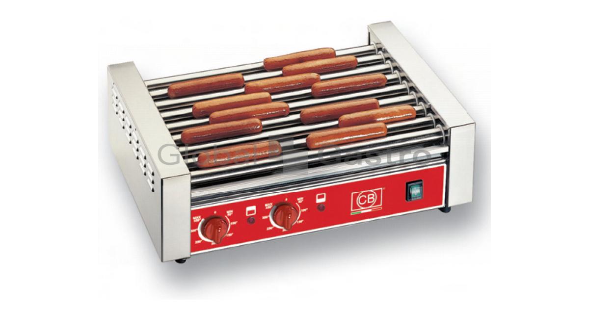 Parametry Výrobce CB Napájení 230 V Příkon 2,8 kW Šířka 560 mm Hloubka 570 mm Výška 180 mm Hmotnost 18 kg Kontrolka chodu ano Materiál válečků nerez Šířka válečků 460 mm Odkapní nádobka ano Počet otočných opékacích válců 9 Provedení pláště nerez Regulace ohřevu párků termostatem
