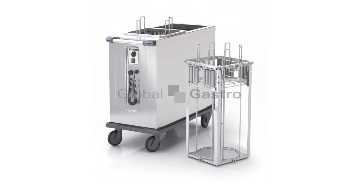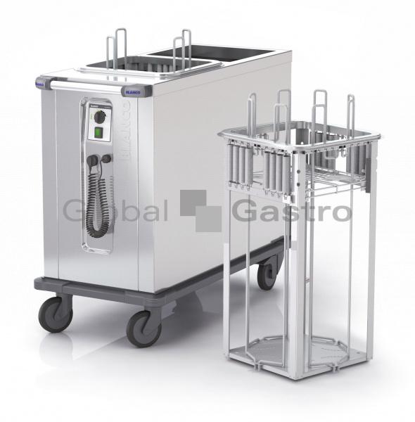 Vyjímatelný zásobník, snadná čistitelnost, údržba a nastavenízátěže talířů. Zásobník je vybaven ukazatelem stavu náplně talířů.Úchyt pro zavěšení čirého polykarbonátového zákrytu. Vyjímatelnázásuvka na odpadní kondenzát. ,, Saving Energy ,, zachování výkonua snížení spotřeby. Celonerezové dvouplášťové a izolované provedení s ohřevem, se čtyřmi pojezdovými kolečky (2× brzděná), rohy jsou chráněny pryžovými dorazy, ergonomické madlo pro snadnou manipulaci v provozu.