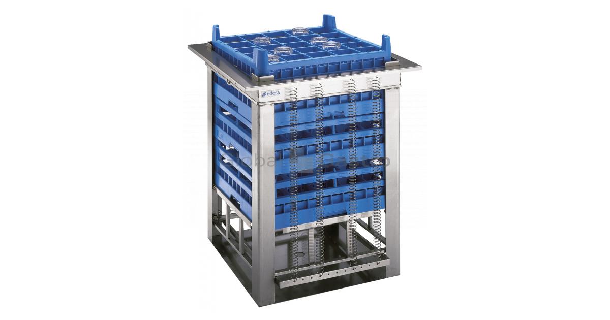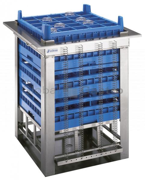 Vestavný neutrální zásobník košů na talíře ASBER BD-55 s dávkovacím systémem ocelových pružin udržujících koše v konstantní výšce pro snadný odběr skla z košů. Dle hmotnosti koše se sklem je možno upravit napnutí pružin. Zásobník je v celonerezovém provedení.