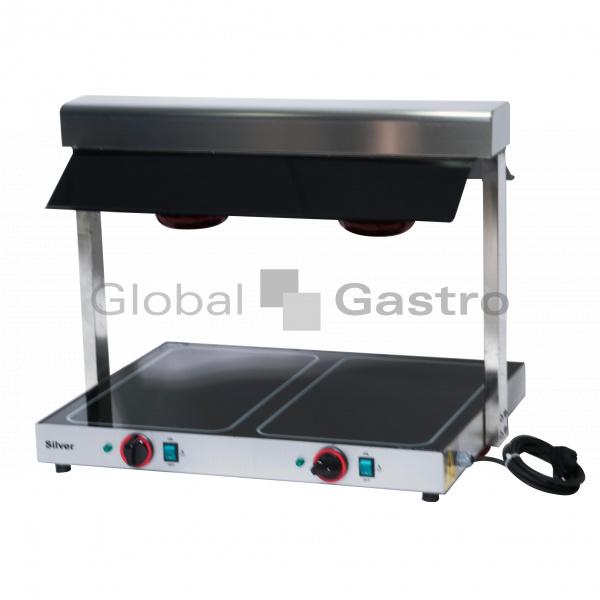 Infra rampa se sklokeramickou udržovací deskou. Provedení nerezové s polykrbonátovým tmavým zákrytem infra ohřevné rampy (2× lampa á150W). Ovládání mechanické pro sklokeramickou ohřevnou desku (levá/pravá strana) + zapnutí/vypnutí jednotlivých infra lamp. + kontrolka chodu.