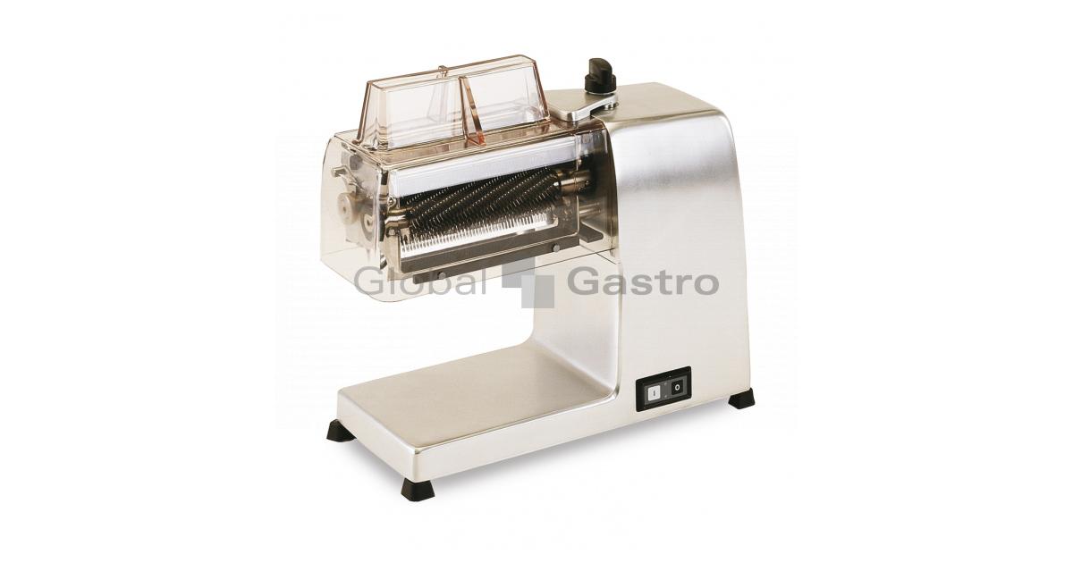 Stroj s vyměnitelnou řeznou sestavou (naklepávací nebo nudličkovací). Polykarbonátový zákryt zajišťuje ochranu i stále viditelnou nožovou sestavu.