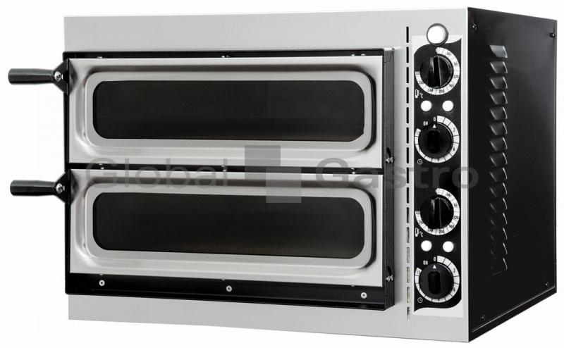 Kompaktní dvoukomorový model pizza pece vhodný pro přípravu klasické pizzy (čerstvé, nebo mražené). Mechanický termostat a časovač ovládá spodní a horní tělesa. Nerezové provedení čela pece a dveří, kvalitní odizolování, komora se šamotovým akumulačním dnem. Provedení VETRO navíc s prosklenými dvířky a osvětlením komory nabízí maximální přehled o pečení uvnitř komory.